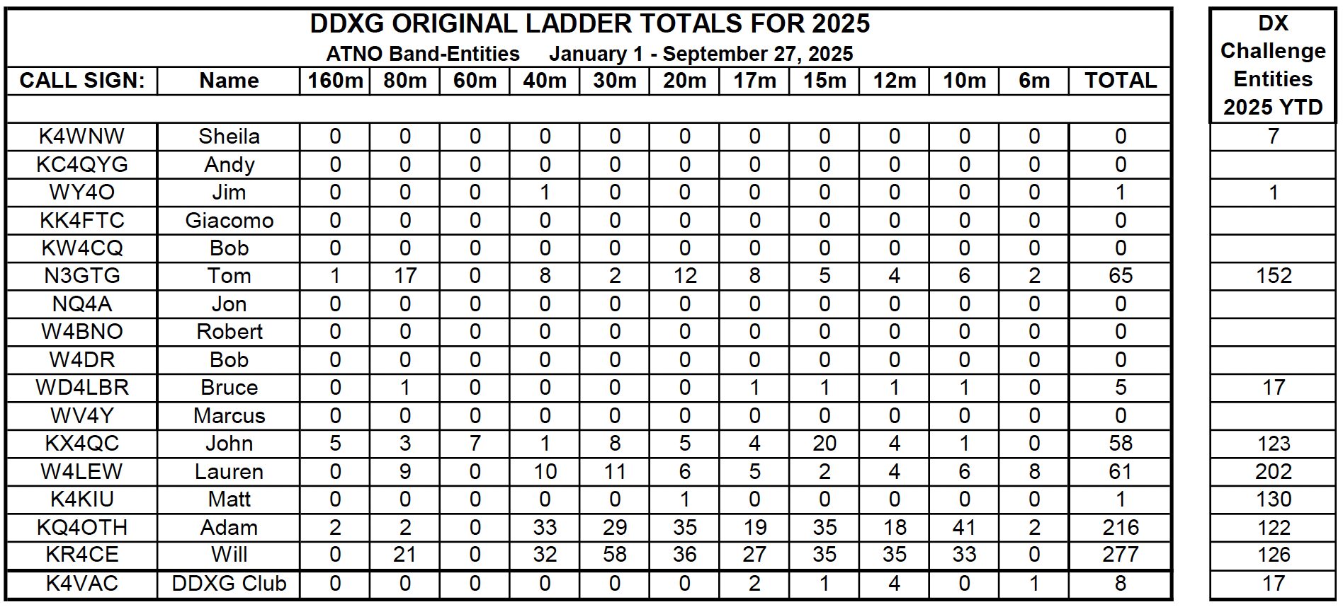 Welcome to the Dominion DX Group DX Ladder Competition. This a friendly competition among club members to see who works the most new band countries per year. In 2025 the previous Super Ladder was replaced with the DX Challenge competition. This competition provides one point for each DX entity contacted regardless of band or mode. The DX Challenge will reset each calendar year. The DX Challenge allows all members to participate even if they have years of operation (and band-countries) under their belts. Results for the DX Ladder and the DX Challenge competitions are presented during our club meetings and will be uploaded below. DDXG President Tom Mundy, N3GTG, is also our competition chair.